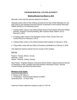1 EVESHAM MUNICIPAL UTILITIES AUTHORITY . Meeting Minutes from March 2, 2016 . Alternate Lutner read the opening statement as follows: Adequate public notice of this ...