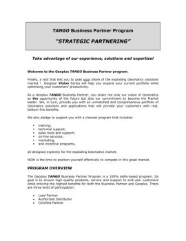 TANGO Business Partner Program “STRATEGIC PARTNERING” Take advantage of our experience, solutions and expertise! Welcome to the Geoplus TANGO Business Partner ...