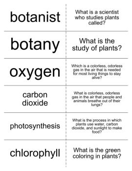 botanist What is a scientist who studies plants called? botany What is the study of plants? oxygen Which is a colorless, odorless gas in the air that is needed