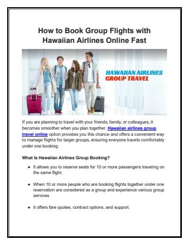 Hawaiian airlines group travel online option provides you this chance and offers a convenient way to manage flights for larger groups, ensuring everyone travels comfortably under one booking. Read more: https://mikoflight.com/blog/hawaiian-airlines-group-travel.php