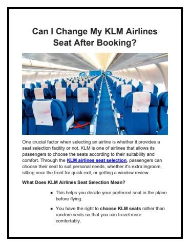 Through the KLM airlines seat selection, passengers can choose their seat to suit personal needs, whether it's extra legroom, sitting near the front for quick exit, or getting a window review. Read More about this content: https://mikoflight.com/blog/klm-flight-seat-selection.php