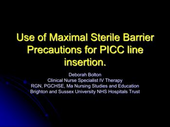 Use of Maximal Sterile Barrier Precautions for PICC line insertion. Deborah Bolton Clinical Nurse Specialist IV Therapy RGN, PGCHSE, Ma Nursing Studies and Education