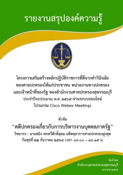 รายงานสรุปผลการดำเนินงานโครงการเสริมสร้างหลักปฏิบัติราชการที่ดีจากคำวินิจฉัยของศาลปกครองให้แก่ประชาชน หน่วยงานทางปกครอง และเจ้าหน้าที่ของรัฐ ของสำนักงานศาลปกครองสุพรรณบุรี ประจำปีงบประมาณ พ.ศ. ๒๕๖๕ ผ่านระบ[ออนไลน์ โปรแกรม Cisco Webex Meetings หัวข้อ “คดีปกครองเกี่ยวกับการบริหารงานบุคคลภาครัฐ” วันพุธที่ ๒๒ ธันวาคม ๒๕๖๔ เวลา ๐๙.๐๐ - ๑๖.๑๕ น.