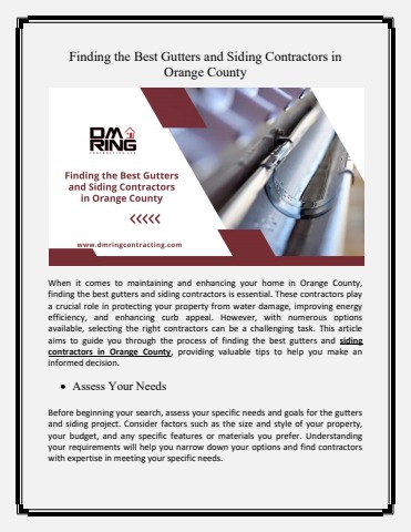 a crucial role in protecting your property from water damage, improving energy efficiency, and enhancing curb appeal. However, with numerous options available, selecting the right contractors can be a challenging task. This article aims to guide you through the process of finding the best gutters and siding contractors in Orange County, providing valuable tips to help you make an informed decision.