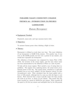PARADISE VALLEY COMMUNITY COLLEGE PHYSICS 101 - INTRODUCTION TO PHYSICS LABORATORY Human Horsepower • Equipment Needed: Stopwatch, mass scale, and tape measure ...