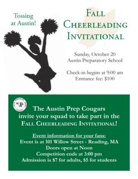 Tossing at Austin! Fall Cheerleading Invitational The Austin Prep Cougars invite you to the Fall Cheerleading Invitational on Sunday, October 20.