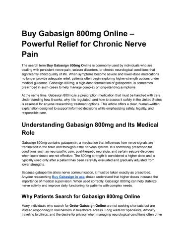 The search term Buy Gabasign 800mg Online is commonly used by individuals who are dealing with persistent nerve pain, seizure disorders, or chronic neurological conditions that significantly affect quality of life. When symptoms become severe and lower-dose medications no longer provide adequate relief, patients often begin exploring higher-strength options under medical guidance. Gabasign 800mg, a high-dose formulation of gabapentin, is sometimes prescribed in such cases to help manage complex or long-standing symptoms.