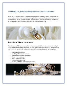 We are the first insurance agency in Singapore, leading jewellery insurance.The insured jewelleries can be diamond, necklaces, rings, watches, bracelets, gold, platinum goods, bullion, unset precious stones or pearls.