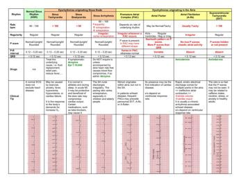 Rhythm : Normal Sinus . Rhythm (NSR) Sinus ; Tachycardia . Bradycardia ; Sinus Arrhythmia . Premature Atrial ; Complex (PAC) Atrial Flutter ; Atrial Fibrillation