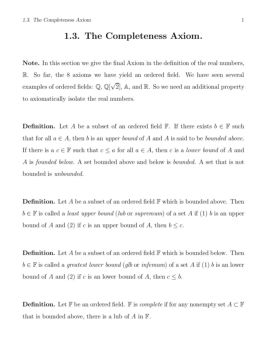1.3. The Completeness Axiom 5 Note. Saying set S is countable is equivalent to saying that there is a one-to-one (maybe not onto) function from S to N.