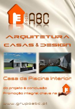 Moradia T3 térrea, isolada, com piscina interior inserida no ambiente da sala comum, composta por hall de entrada, sala comum, cozinha, 3 quartos, um deles quarto/suíte, corredor, wc geral e wc privado