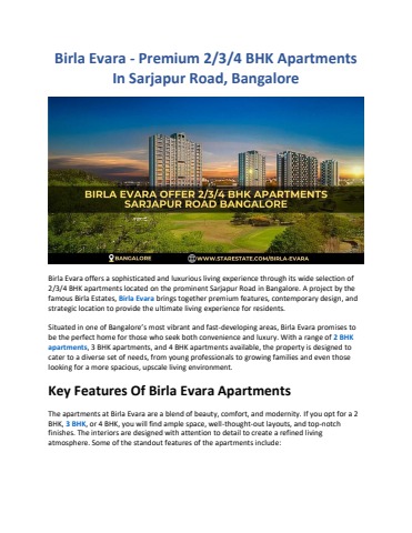 Birla Evara offers spacious 2/3/4 BHK apartments on Sarjapur Road, Bangalore. Enjoy premium living with modern amenities at Birla Evara. This iconic development is designed for comfort and convenience, making it the perfect choice for your next home. Find luxurious living at Birla Evara, where every detail is crafted to enhance your lifestyle. Invest in a home at Birla Evara and experience the best of Bangalore. Visit Now