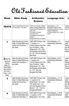 Old Fashioned Education Kindergarten Curriculum Week Bible Study Arithmetic/ Science Language Arts Literature Biography/ Historical Novels History Social Studies