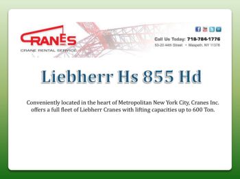 Adds vice president Robert Weiss, “To complement our fleet, we employ a highly skilled and well trained staff of mechanics. Our service manager, Robert Serrone, has been with Cranes, Inc. for over 30 years and has received extensive training at the Liebherr factories in Ehingen, Germany, and Nenzing, Austria. Cranes, Inc. is proud to offer our customers a modern fleet of equipment backed by a true commitment to service.”