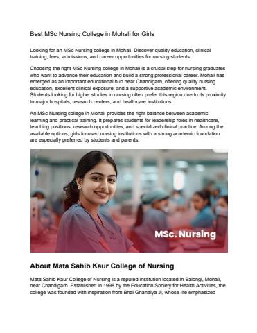 Choosing the right MSc Nursing college in Mohali is a crucial step for nursing graduates who want to advance their education and build a strong professional career. Mohali has emerged as an important educational hub near Chandigarh, offering quality nursing education, excellent clinical exposure, and a supportive academic environment. Students looking for higher studies in nursing often prefer this region due to its proximity to major hospitals, research centers, and healthcare institutions.