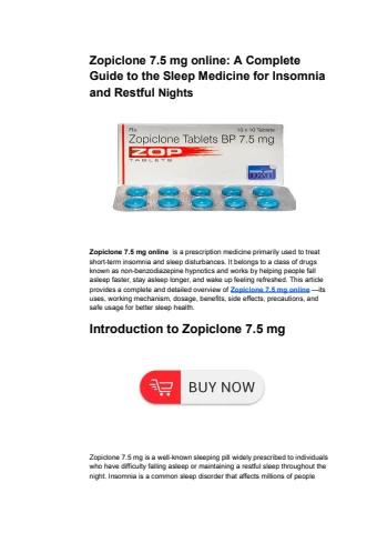 Zopiclone 7.5 mg online is a prescription medicine primarily used to treat short-term insomnia and sleep disturbances. It belongs to a class of drugs known as non-benzodiazepine hypnotics and works by helping people fall asleep faster, stay asleep longer, and wake up feeling refreshed.