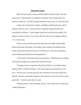Mason Bee Cocoons Mason bee larvae spin a strong, insulated, pinkish colored, weather- and water- proof cocoon. Metamorphosis is completed in September when the pupa ...