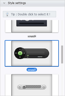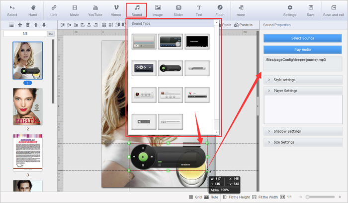 Click the “Sound” icon and select an audio player to add it to the page. And then you can click “Select Sounds” to add multiple audio files.