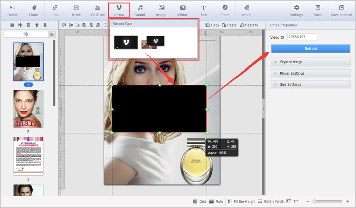 Click the “Vimeo” icon and select a video player to add it to the page. And then you can input the Vimeo video ID directly and click “Refresh” to apply the video.