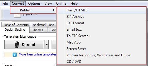Export Current Settings as Theme: Export current settings as a theme (*.thm format file) and you can apply these settings to other flipbooks.