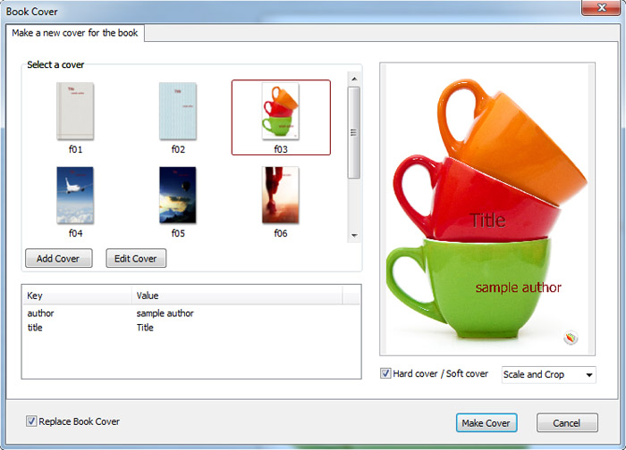 You can edit the cover by adding text, image and info (author, title and logo). And you can make the cover as hard cover or soft cover.