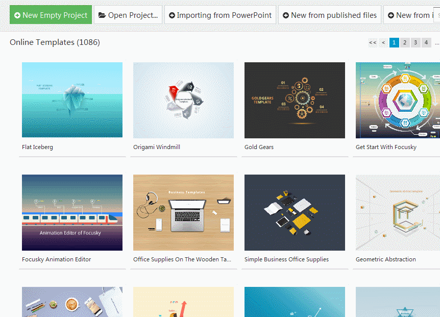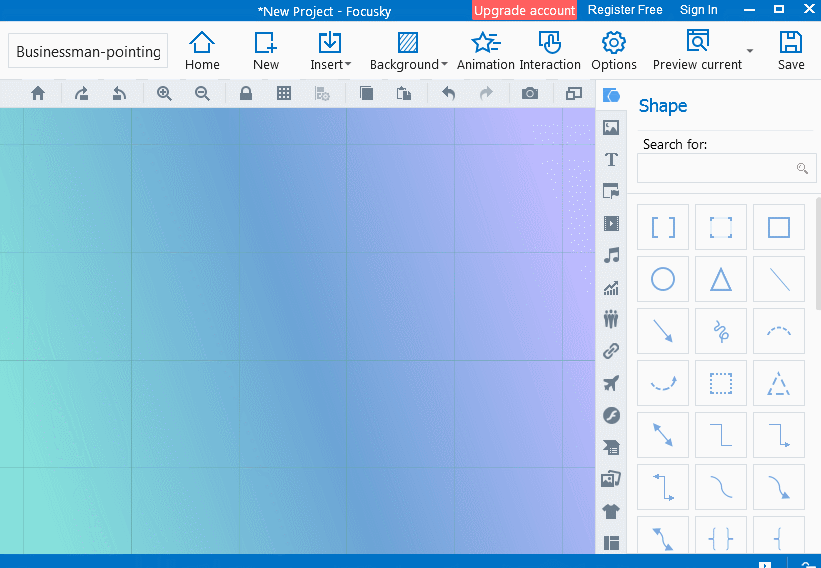 There are lots of pre-designed material supporting you even you have nothing prepared and skills of designing. Begin with a new project, you can have the chances to choose to layouts and background color. The layouts are all designed the professional designers from Focusky. Everyone is suitable for most of the theme. Talking about the background color, there are pure color and gradient color available for you. After that, you will see the guidance for the use of the toolbar.