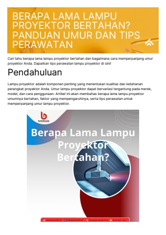 Lampu proyektor merupakan salah satu komponen penting yang mempengaruhi kualitas tampilan dan masa pakai proyektor. Umumnya, umur lampu proyektor bervariasi antara 2.000 hingga 5.000 jam penggunaan, tergantung pada jenis dan kualitas lampu. Dengan perawatan yang baik, seperti menjaga kebersihan filter udara dan menghindari overheat, umur lampu bisa diperpanjang. Artikel ini akan memberikan panduan lengkap tentang berapa lama lampu proyektor bertahan dan tips perawatan agar proyektor Anda tetap optimal.
