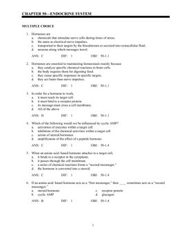 1 CHAPTER 50ENDOCRINE SYSTEM MULTIPLE CHOICE 1. Hormones are a. chemicals that stimulate nerve cells during times of stress. b. the same as electrical nerve impulses.