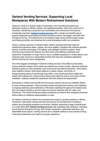 Garland is home to a diverse range of businesses, from manufacturing plants and distribution centers to offices, schools, and healthcare facilities. With such a wide mix of industries, maintaining a productive and comfortable work environment has become increasingly important. Garland vending services offer a simple yet impactful way to support employees by providing convenient access to snacks, beverages, and fresh food throughout the day. This added level of convenience helps reduce off-site breaks, keeps work flowing smoothly, and enhances the overall atmosphere within any workplace.