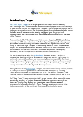 JimYellow Pages, Tiruppur, is an integral part of India's largest business directory, JimYellowPages.com. With a substantial database comprising approximately 10,000 listings of manufacturers, dealers, and suppliers from Tiruppur, it serves as a pivotal resource hub for businesses across various sectors.