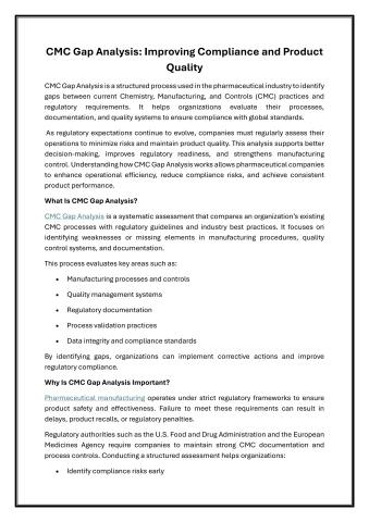 CMC Gap Analysis is a systematic assessment that compares an organization’s existing CMC processes with regulatory guidelines and industry best practices.