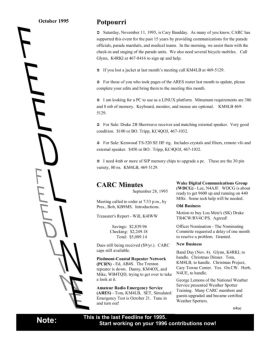This is the last Feedline for 1995. Start working on your 1996 contributions now! October 1995 Note: Potpourri!"Saturday, November 11, 1995, is Cary Bandday.