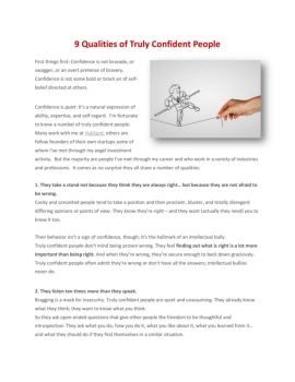 9 Qualities of Truly Confident People First things first: Confidence is not bravado, or swagger, or an overt pretense of bravery. Confidence is not some bold or brash ...
