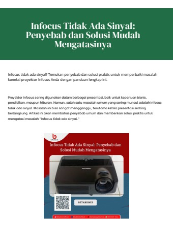 Jika proyektor BenQ atau Infocus tidak menampilkan sinyal, ada beberapa penyebab yang mungkin terjadi. Periksa kabel koneksi (HDMI, VGA, atau lainnya) apakah terpasang dengan benar dan tidak rusak. Pastikan sumber input (laptop, PC, atau perangkat lainnya) telah dipilih dengan benar pada proyektor. Coba restart perangkat sumber dan proyektor. Jika tetap tidak ada sinyal, lakukan reset pada proyektor atau perbarui firmware. Periksa juga apakah pengaturan resolusi pada perangkat sumber kompatibel dengan proyektor.