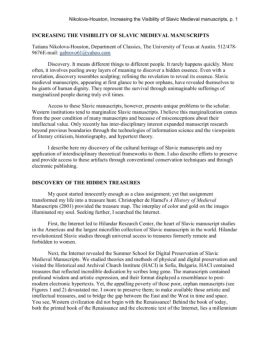 Nikolova-Houston, Increasing the Visibility of Slavic Medieval manuscripts, p. 3 The hunt for Slavic manuscripts began early in the 20th century as scholars searched for