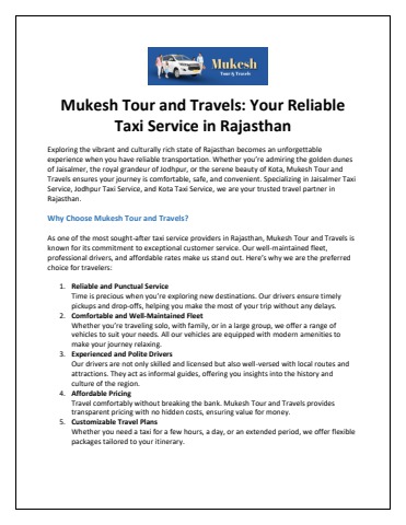 Mukesh Tour and Travels Your Reliable Taxi Service in Rajasthan