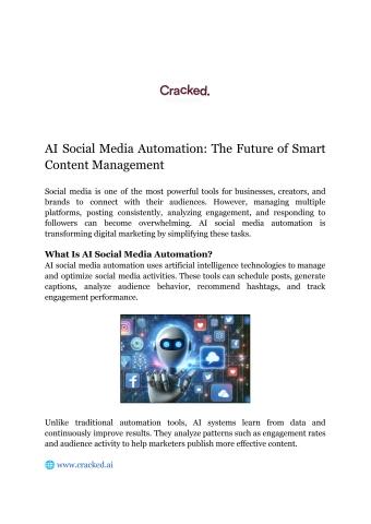 This document explores how AI social media automation is changing the way businesses manage and optimize their social media presence. It highlights the role of artificial intelligence in automating tasks such as content scheduling, audience analysis, and performance tracking. The paper also discusses key benefits, features, and future trends of AI-powered social media management.