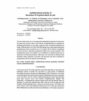 Vtdyodaya J. of Sci, (2IJ05) ~()r 12,pp 57-63 Antidiarrhoeal activity of decoction ofScoparia dulcis in rats W.D.Rntnasooriya ." G. Galhena', S.S.P.Liyanage·, J.R.A ...