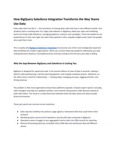 Every sales team has felt it — the frustration of chasing down data that lives in two different worlds. Your analytics team is working with rich, large-scale datasets in BigQuery, while your sales and marketing teams are living inside Salesforce, managing pipelines, contacts, and campaigns. These two platforms are powerhouses in their own right, but when they operate in silos, valuable insights never reach the people who need them most.