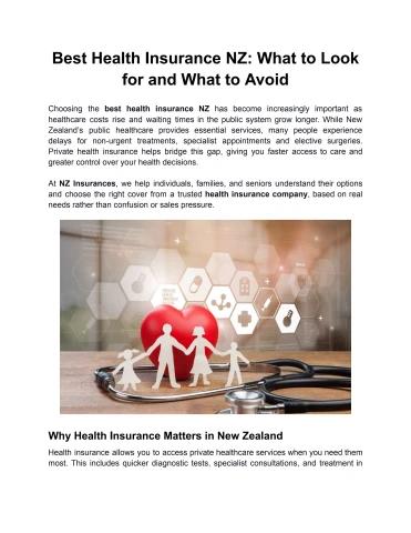 This PDF explains how to choose the best health insurance NZ has to offer, highlighting what to look for and what to avoid when comparing policies. It covers essential features such as hospital and surgical cover, specialist access and flexible family health insurance options, while also warning against common mistakes like unnecessary extras and hidden exclusions. The guide is designed for families, individuals and senior citizens. This guide will help you comprehend how a trustworthy health insurance company can give you more rapid access to health care and provide peace of mind. With the help of experts from NZ Insurances, this resource helps you choose the best health insurance policy easily, efficiently, and easy.