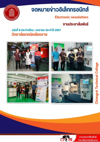จดหมายข่าวอิเล็กทรอนิกส์ ฉบับที่ 9 ประจำเดือนมกราคม 2567 / เป็นสื่อในการเก็บรวบรวมกิจกรรมของผู้บริหาร ครู นักเรียน นักศึกษา และบุคลากรทางการศึกษาของวิทยาลัยเทคนิคเชียงราย จัดทำโดยงานประชาสัมพันธ์ วิทยาลัยเทคนิคเชียงราย
