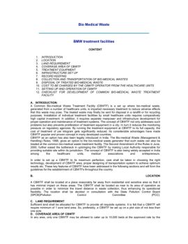 Bio Medical Waste BMW treatment facilities CONTENT 1. INTRODUCTION 2. LOCATION 3. LAND REQUIREMENT 4. COVERAGE AREA OF CBWTF 5. TREATMENT EQUIPMENT
