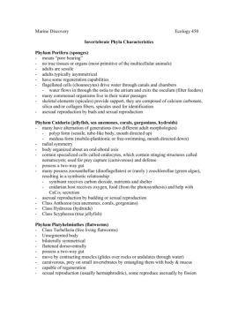 Invertebrate Phyla Characteristics Phylum Porifera (sponges)