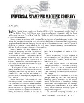 Bowes became the sole salesman for Universal Stamping Machine Corporation, which had just been incorporated in New Jersey in 1908. Graham’s idea that the cheque-