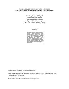 TECHNOLOGY REVIEWS AND STUDIES Chemically Bonded Phosphate Ceramics: Cementing the Gap between Ceramics, Cements, and Polymers S. Y. Jeong† and A. S. Wagh