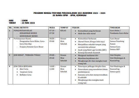 PROGRAM MINGGU PERTAMA PERSEKOLAHAN SESI AKADEMIK 2023