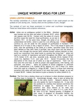 UNIQUE WORSHIP IDEAS FOR LENT USING LENTEN SYMBOLS The worship committee of a church asked their pastor if she could preach on the symbols of Lent during Lent.