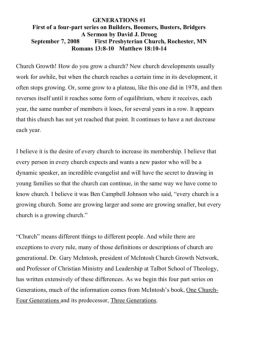GENERATIONS #1 . First of a four-part series on Builders, Boomers, Busters, Bridgers . A Sermon by David J. Droog . September 7, 2008 First Presbyterian Church ...