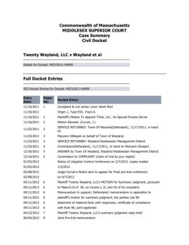 Commonwealth of Massachusetts MIDDLESEX SUPERIOR COURT Case Summary Civil Docket Twenty Wayland, LLC v Wayland et al Details for Docket: MICV2011-04095