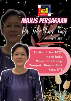 Majlis Persaraan Puan Teh Ying Ting merupakan satu majlis khusus yang diadakan sempena meraikan persaraan beliau di kolej ini. Majlis yang bakal diadakan adalah bagi mengenang jasa dan bakti beliau sejak berkhidmat di kolej ini pada bulan Januari 2019. Majlis Puan Teh Ying Ting akan diadakan bagi menghargai sumbangan dan jasa yang telah ditaburkan oleh beliau, terutamanya sebagai guru MUET di kolej ini. Beliau bukan sahaja menjalankan tugasnya dengan penuh cemerlang dalam membimbing unit MUET, malah berdedikasi dan bersungguh-sungguh dalam mendidik pelajar KTETF ke arah kecemerlangan